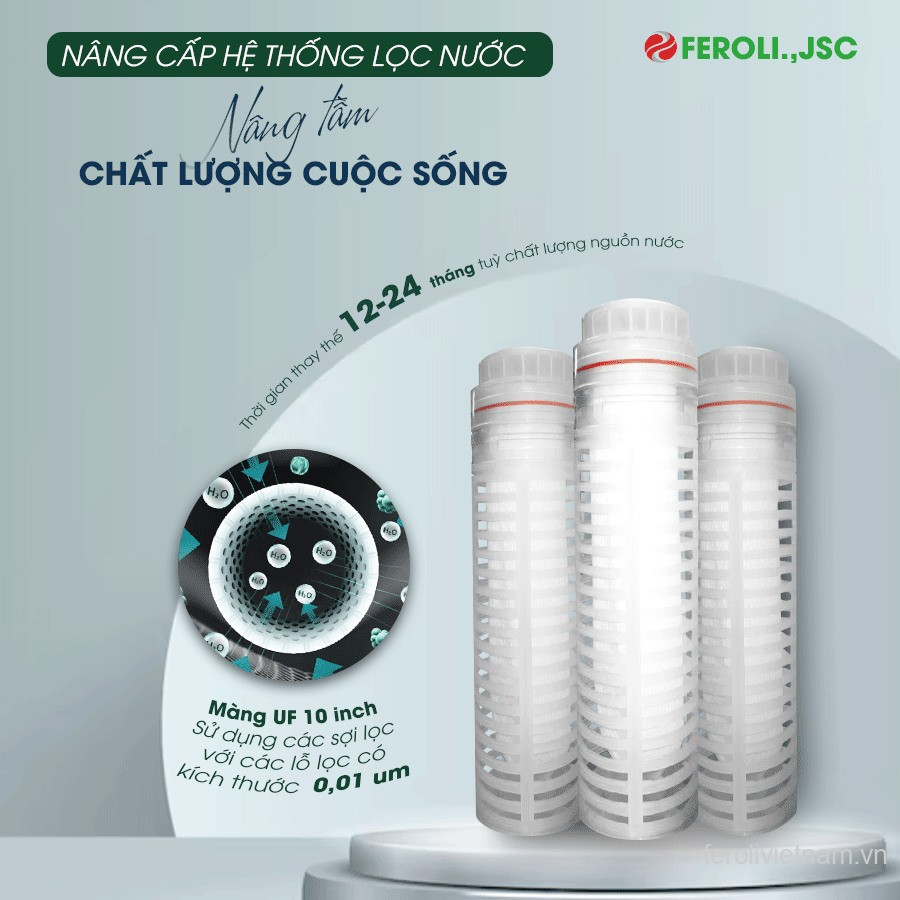 Là sản phẩm thuộc hệ thống lõi lọc chính hãng của Feroli.,JSC, màng lọc UF 10 inch được sản xuất theo tiêu chuẩn kỹ thuật nghiêm ngặt, đảm bảo độ bền cao, khả năng lọc ổn định và tương thích tối ưu với các dòng máy lọc nước RO. Việc sử dụng lõi UF 10 inch giúp tối ưu hiệu suất lọc tổng thể, giảm áp lực cho màng RO trung tâm, từ đó nâng cao chất lượng nước sau lọc và tiết kiệm chi phí bảo trì, thay thế cho người dùng. Feroli.,JSC cam kết mang đến giải pháp lọc nước an toàn, hiệu quả và bền vững, đáp ứng nhu cầu sử dụng nước sạch lâu dài cho gia đình và văn phòng.